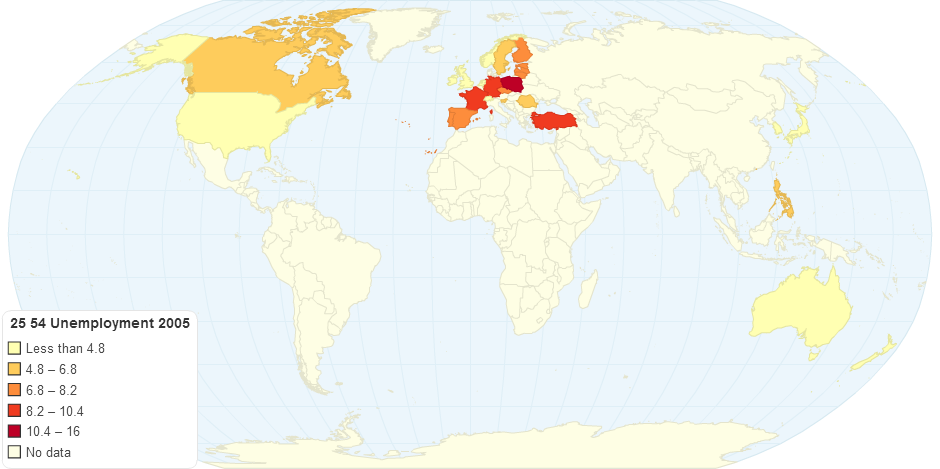 The percentage of unemployment for adults aged between 25 and 54 in the year 2005.