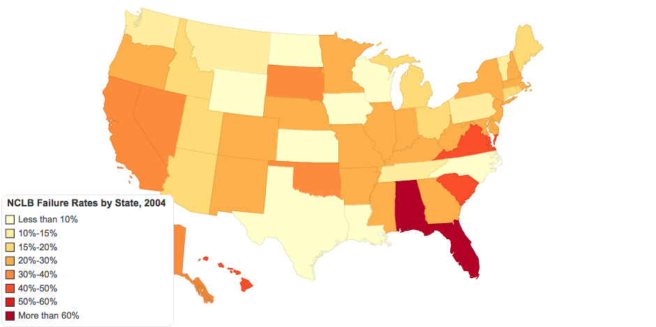 Map of No Child Left Behind school failure rates by state in 2003. Hover over each state to see breakdown of failure rate by school level.