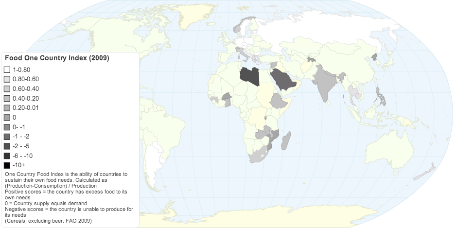 One Country Food Index is the ability of countries to sustain their own food needs. Calculated as (Production-Consumption) / Production