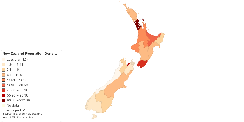 This map shows current New Zealand Population Density by regions.