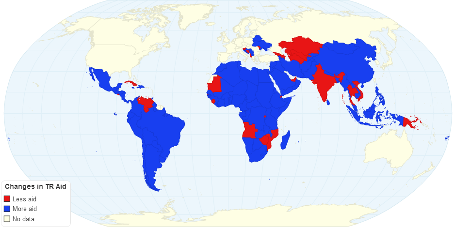 Which countries have received more or less aid since Turkey since 2003? 2003 is chosen because in Nov. 2002 the current AKP government came to power. Developed countries and those on which we do not have data are left blank.