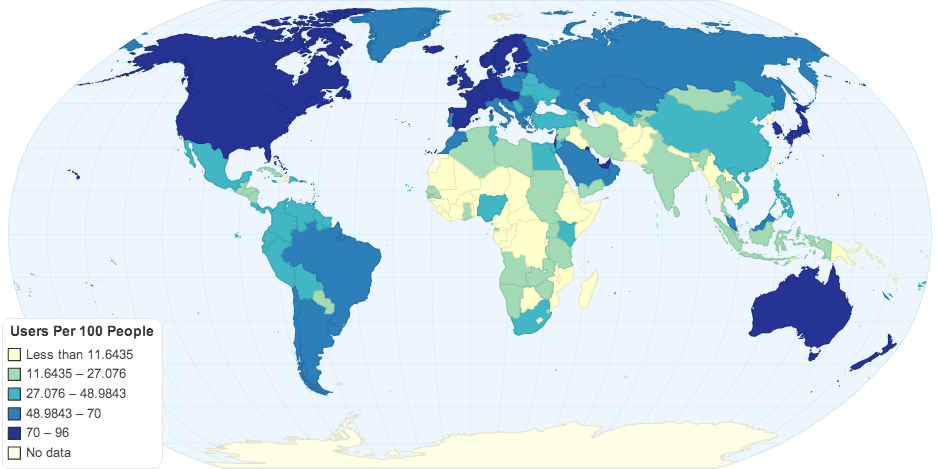 Internet users per 100 people as of 2012. Data collected from World Bank.