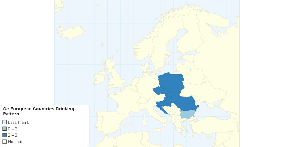 This map shows CE European Countries (members of EU) alcohol drinking patterns. Alcohol drinking patterns is based on Patterns of Drinking Score for Poland, Czech Republic, Slovakia, Hungary, Slovenia, Croatia, Romania and Bulgaria.