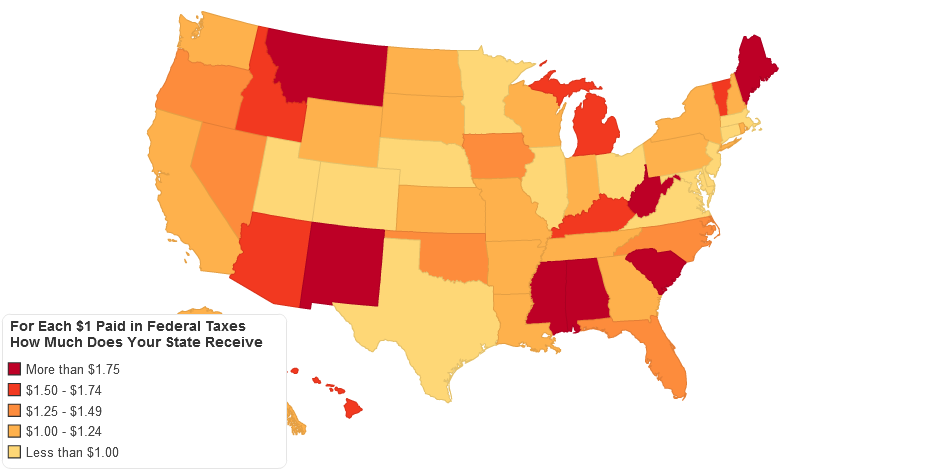 For each $1 paid in Federal taxes, how much does your state receive?, http://talkingpointsmemo.com/dc/the-map-that-proves-red-staters-use-the-safety-net-too, viewed 4th November, 2013.