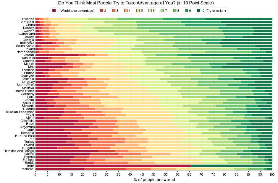 This chart shows the result of (one question in) survey conducted by the World Values Survey (WVS) about Perceptions of Life: Do you think most people would try to take advantage of you if they got a chance, or would they try to be fair?