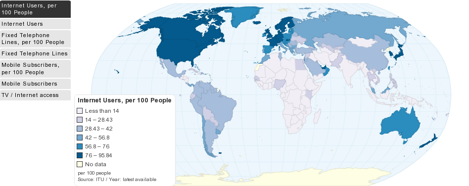 This world map shows Number of Internet Users by Country, per 100 people. Internet users are people with access to the worldwide network. Current worldwide number of internet users: 29.7 per 100 people (2010) Internet users – which may re ...