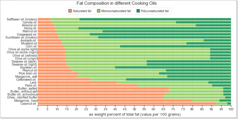 These charts shows fat composition and smoke point of different Cooking Oils. Cooking oil is purified fat of plant/animal origin, which is usually liquid at room temperature (saturated oils such as coconut and palm are more solid at room temperature than other oils).