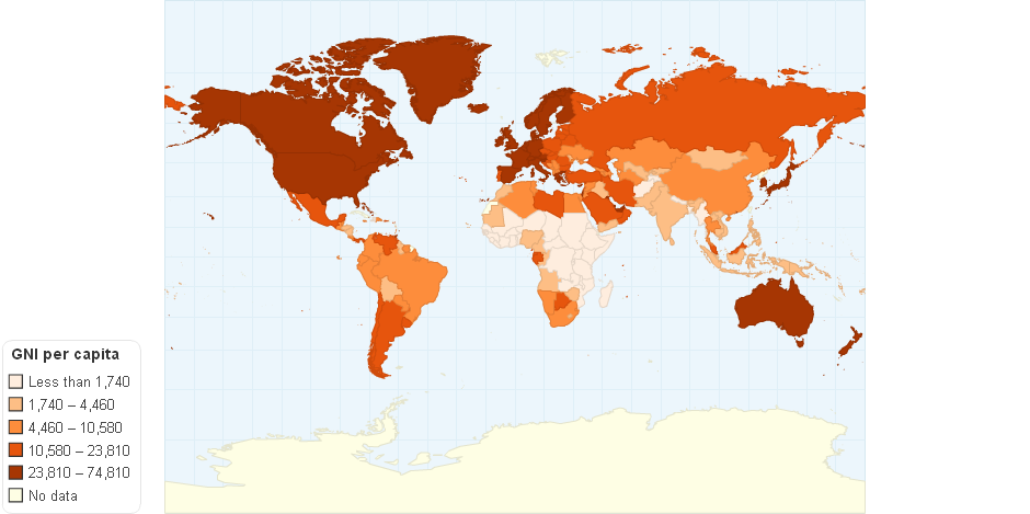 This map shows the GNI(Gross National Income) per capita (purchasing power parity method) for current international US$ for the year 2007.