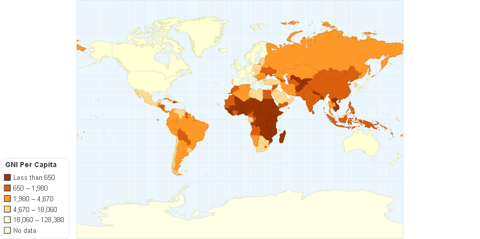 This map shows the GNI (Gross National Income) per capita using atlas method for Current US$ fro the year 2005. Made by chartsbin