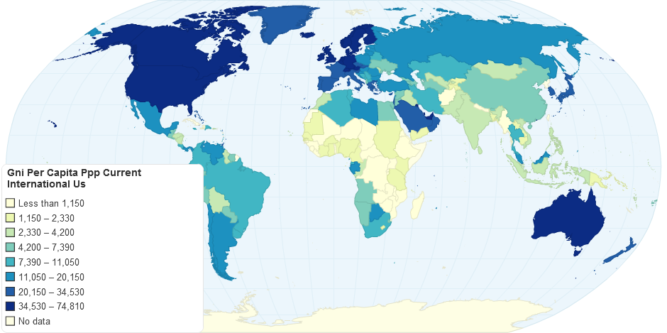 The GNI per capita, PPP ( current international US$) for almost all the countries in 2007.