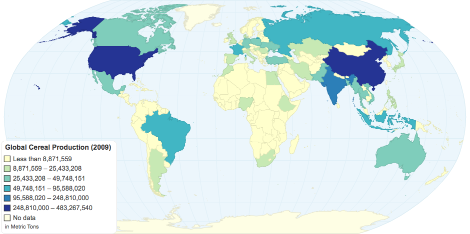 Global Cereal Production by Country in Metric Tons (2009). Source: United Nations Food and Agriculture Organization (http://faostat.fao.org/site/567/default.aspx)