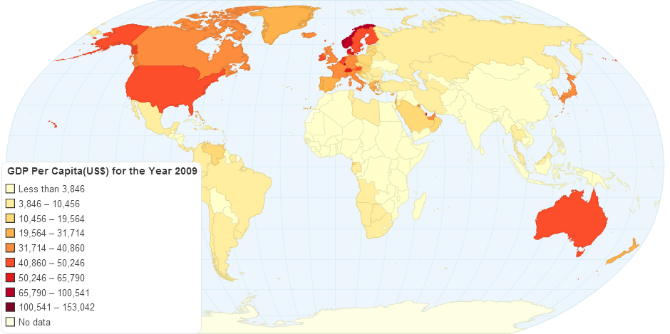 This map shows the GDP per capita of countries in the world in 2009. The main data was taken from World Bank. Several small ountries were not decided to be included. The data of country Somalia and Myanmar can be found on United Nations' data website, and the links were given in the table.