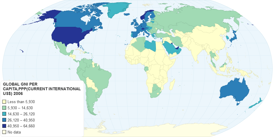 This graph shows the GNI per capita,PPP(currentinternational US$) of the world for the year 2006.