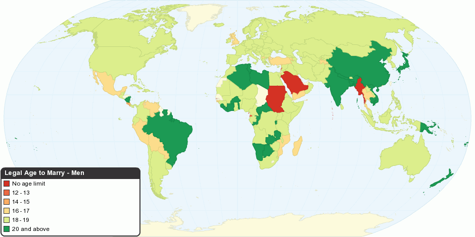 | Yemen | 17 | 2002 | Based on age of majority. Marriage may not be contracted with a minor, except where such marriage will entail some clear benefit. |
