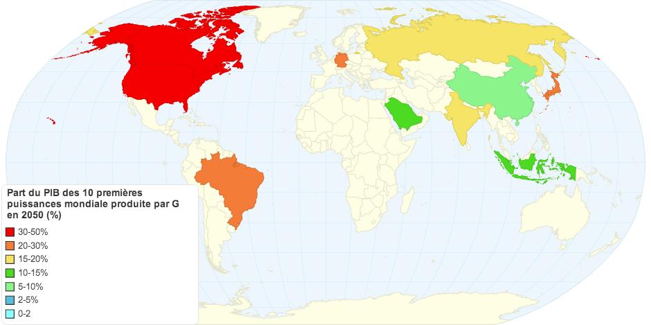 Part du PIB des 10 premières puissances mondiale produite par G en 2050 (%)