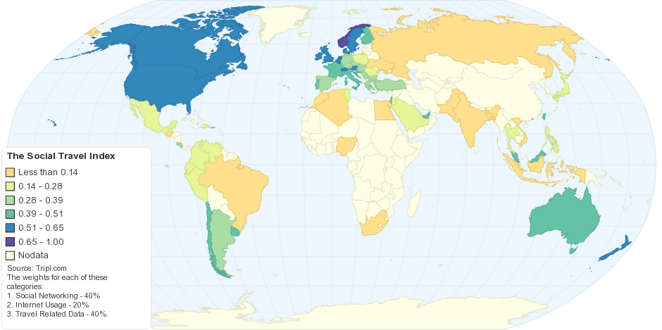 The Internet has allowed the world to become a much more global environment where geographic boundaries are eliminated and human interaction goes way beyond national borders. The rise of social networking combined with continuous growth of international travel has produced an opportunity to communicate with travelers, locals, and people within your network that transcends cultural differences and increases the overall travel experience. Tripl is building the world’s most comprehensive social travel platform, and was interested in measuring which countries would be impacted the most by a “social travel” product. An index was produced that took into consideration national Internet usage, social networking usage, and travel related activity.