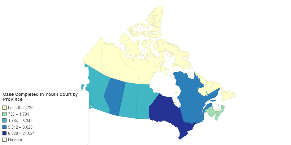 This data illustrates the number of cases that were completed in youth court throughout each province.