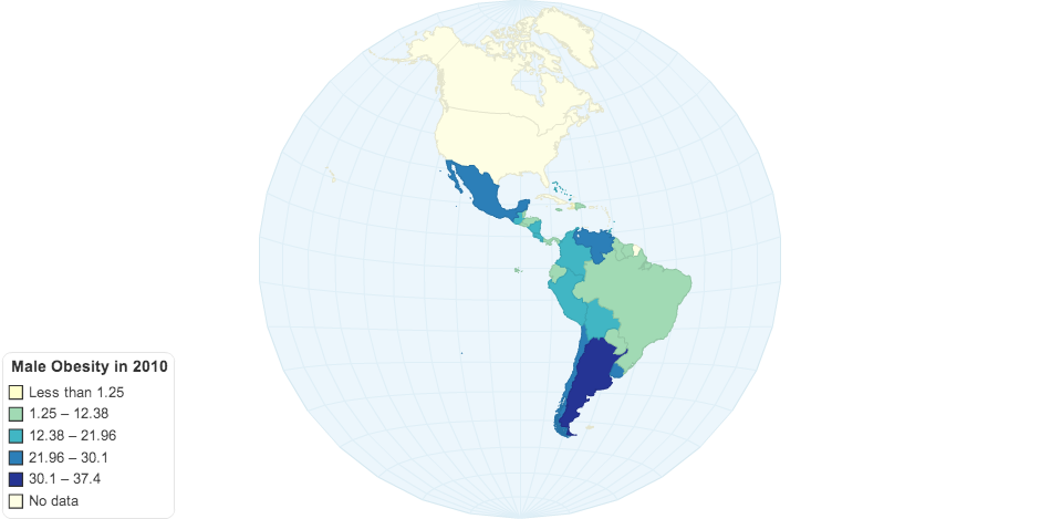 First, countries with a higher GDP per capita exhibit high prevalence of obesity (BMI >30) The paramount examples are Argentina (37.4%) and Mexico (30.06% Second, the Caribbean islands show high level of obesity. Although this is true for men and women, the latter group exhibits higher prevalence, particularly in Barbados, Jamaica and Trinidad and Tobago) Third, countries with limited food supply and high levels of undernutrition also suffer from high prevalence of obersity. This is the case for Bolivia, Guatemala and Nicaragua.