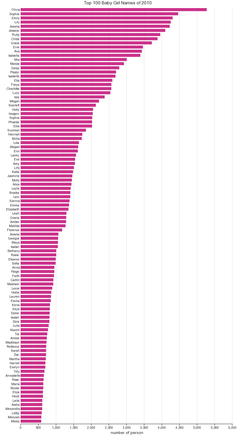 This chart shows top 100 baby girl names in England and Wales through 2010.