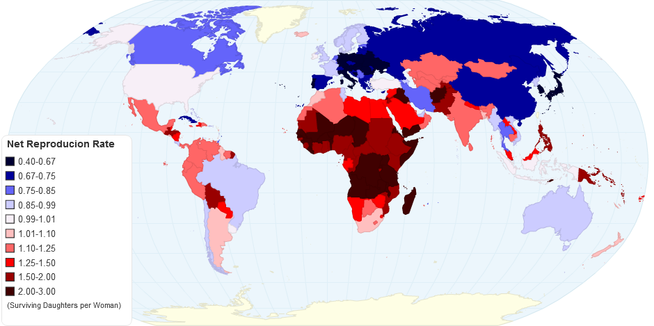An estimate of the number of daughters each woman would give birth to who would survive into their childbearing years, if each woman and daughter was subjected to age-specfic average mortality and fertility within her country.