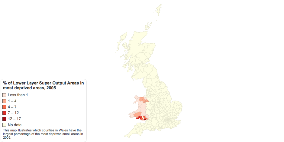 This map illustrates which counties in Wales that had the lagerst percetages of the 10% most deprived small areas.