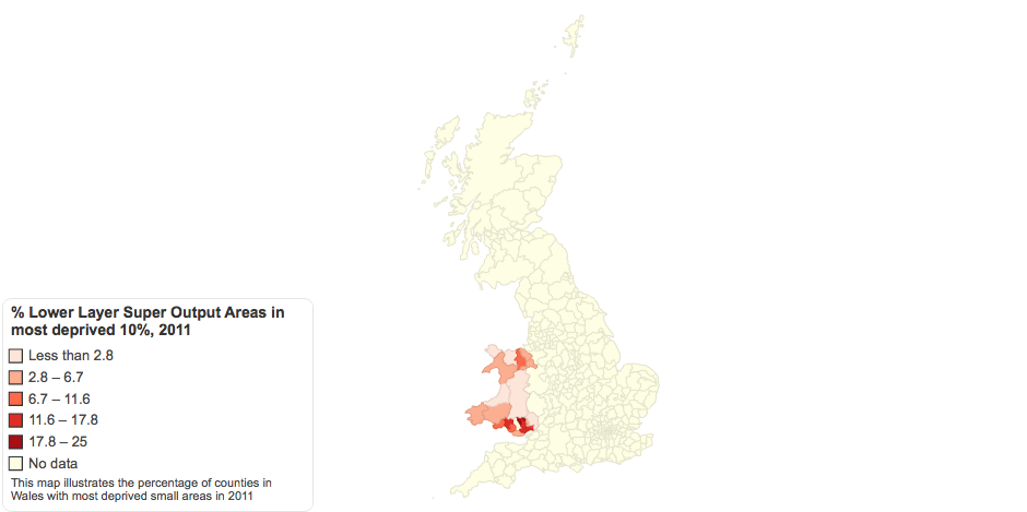 This map illustrates the percentage of which counties in Wales that had the larges number of the 10% most deprived small areas in 2011.