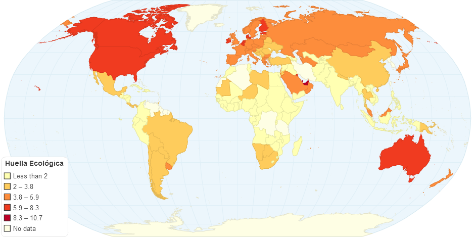 Huella ecológica en hectareas per cápita por país. Datos de 2010.