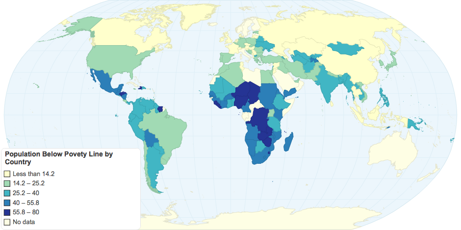 A map illustrating the population that lives below the poverty line by country. Data from The World Bank via indexmundi.com (http://www.indexmundi.com/g/r.aspx?t=0&v=69&l=en)