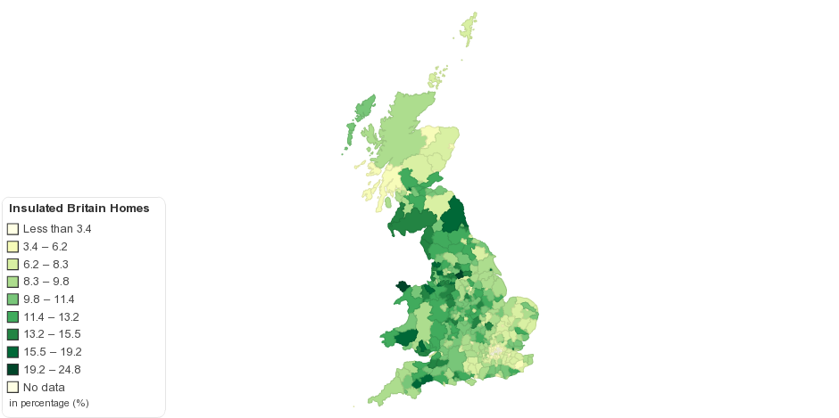 This interactive map shows percentage of British homes have been insulated by the Government's Carbon Emissions Reduction Target (CERT).