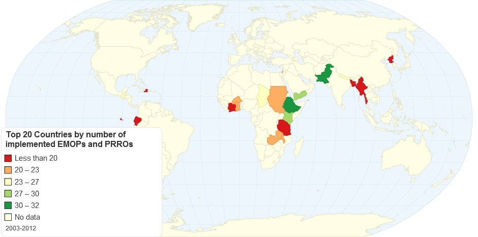Top 20 countries by highest number of implemented EMOPs and PRROs and distributed by hazard types, EM-DAT: The OFDA/CRED International Disaster Database – www.emdat.be – Université catholique de Louvain – Brussels – Belgium, viewed 18th February, 2014.