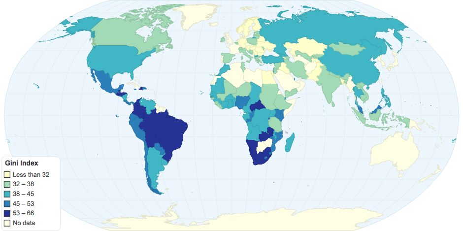 Gini Index collected by World Bank. Most recent year of index used. Countries with most recent year being previous to 2000 were excluded. ECON 322
