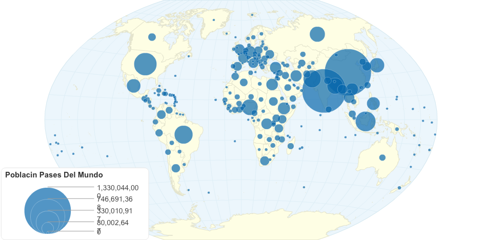 Población por país en un mapa cromático cada 100 millones de habitantes.