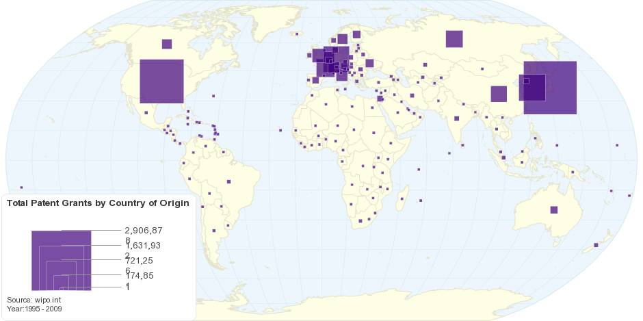 This map show total Patent Grants by Country of Origin for the period 1995 - 2009.