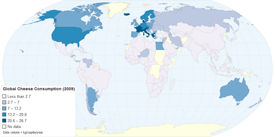Interactive map of 2009 cheese consumption levels from a global perspective. The map displays consumption values measured in kg/per person/year.
