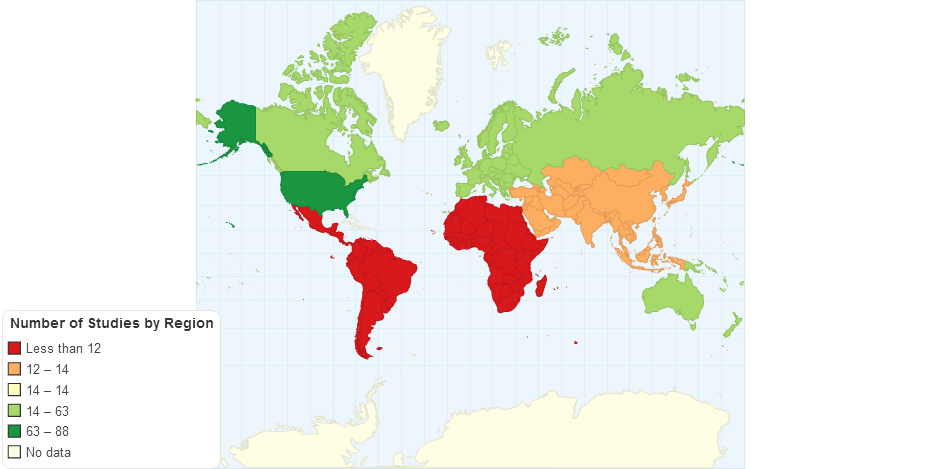 Green version. Number of empirical studies reviewing research ethics review by region. The regions described are: Canada, USA, Europe, Asia, Africa, and Oceania.