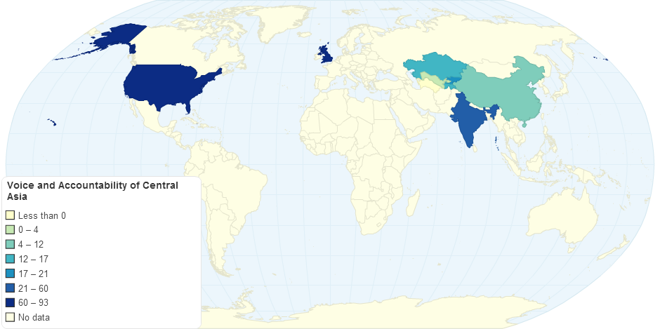 A map of WGI's Voice and Accountability Index for Central Asia in 2003 with comparisons to major powers on the region (China and India) as well as other world leaders (U.S. and U.K.)