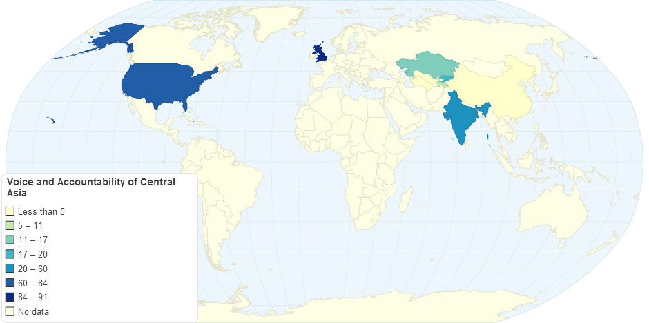 A map of WGI's Voice and Accountability Index for Central Asia in 2009 with comparisons to major powers on the region (China and India) as well as other world leaders (U.S. and U.K.)