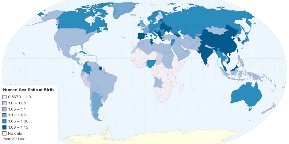 This map shows worldwide human sex ratio at birth. Sex ratio is the number of males for each female.