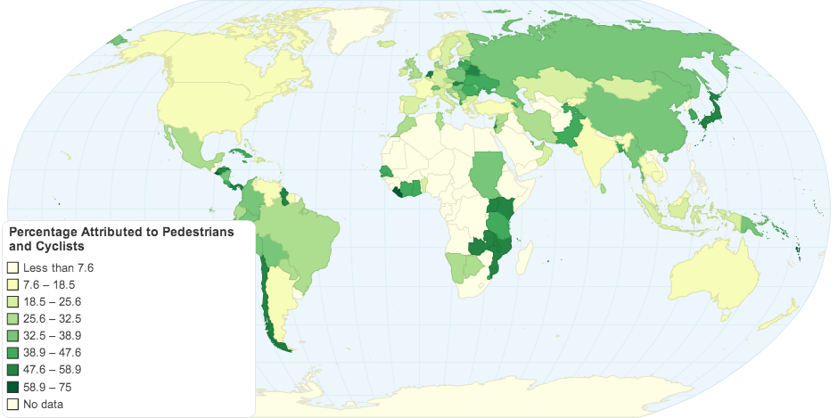 Pergentage of pedestrians and cyclists that account for a country's road traffic fatalities. Using 2010 data provided in the WHO Global Road Safety Status Report for 2013.