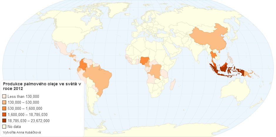 Produkce palmového oleje ve svÄ›tÄ› v roce 2012 udávaná v tunách.