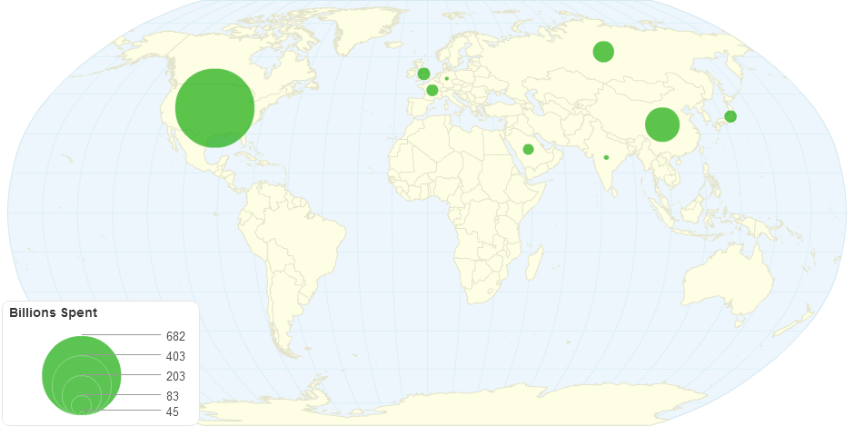 This infographic illustrates the world's nine largest defense budgets. This data was gathered and published by Stockholm International Peace Research Institute and has been cited by news organizations such as the BBC. The numbers listed indicate billions of dollars spent.