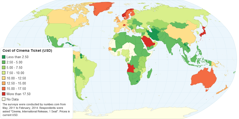 DEFINITION: Cinema, International Release, 1 Seat. Based on 0-50 contributions for Afghanistan, Aland Islands, Andorra and 81 more countries and 50-100 contributions for Albania, Algeria, Armenia and 19 more countries and over 100 contributions for Argentina, Australia, Austria and 82 more countries. The surveys were conducted by numbeo.com from May, 2011 to February, 2014. See this sample survey for the United States, respondents were asked "Cinema, International Release, 1 Seat". Prices in current USD..