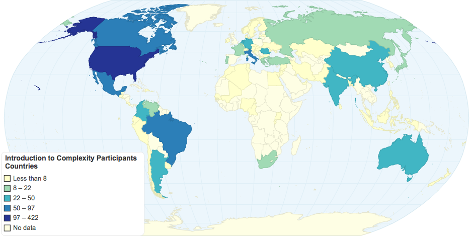 Number of participants from different countries in SFI's Introduction to Complexity Course, Spring 2014