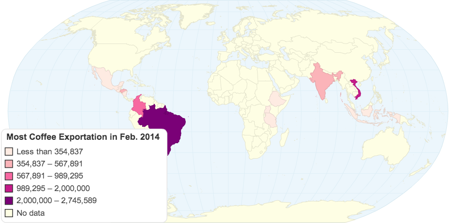 The coffee exportation in Feb. 2014 of the highest exporting countries in the world shaded in with color.