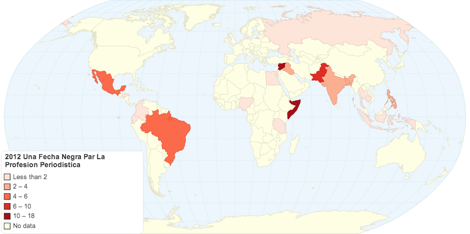 Muchos medios y periodistas han pagado duro la cobertura de las aspiraciones democráticas de los ciudadanos o los movimientos de oposición. Según Reporteros Sin Fronteras, 2012 ha sido el año más negro para la profesión desde 1995. 89 periodistas fueron asesinados en Asia (52), África (22) y América (15). En el otro lado se encuentra el norte de Europa: Finlandia y los Países Bajos y Noruega son los países donde más se respeta la profesión., viewed 25th April, 2014.