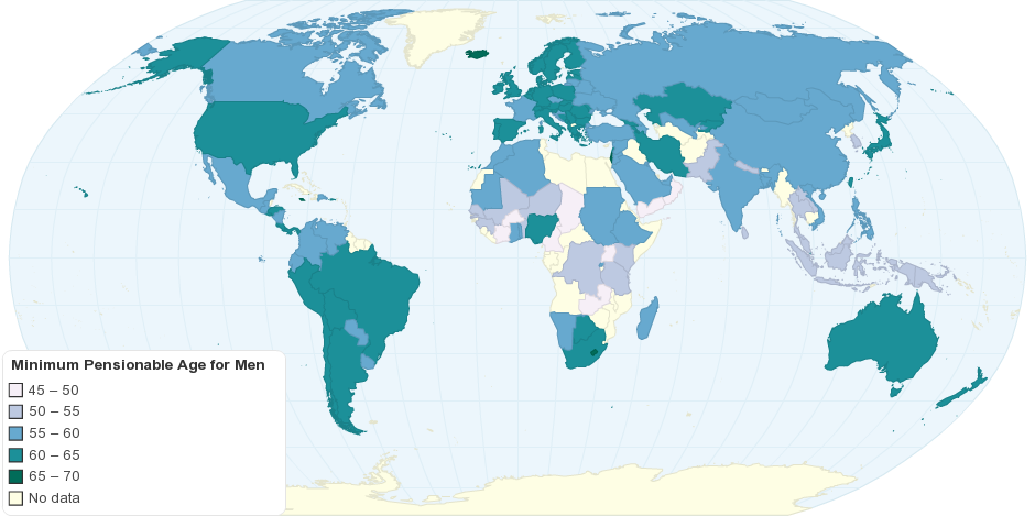 This map shows the minimum pensionable age for men. The minimum pensionable age is the age at which men can retire and receive pension benefits, even if the benefits are smaller than they would have been at the statutory retirement age. Minimum pensionable age is also called early pensionable age.