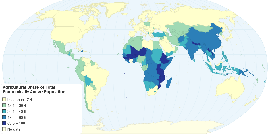 Worlwide view of the share of the economically active population in Agriculture