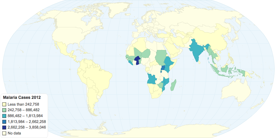 Number of cases in 2012 for each country. Countries that do not show up are non-endemic.
