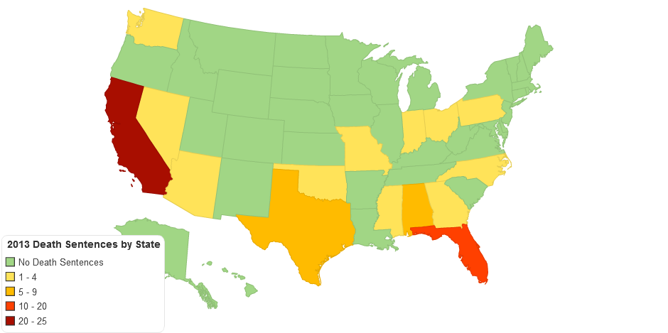 Number of death sentences handed down by each U.S. State in 2013