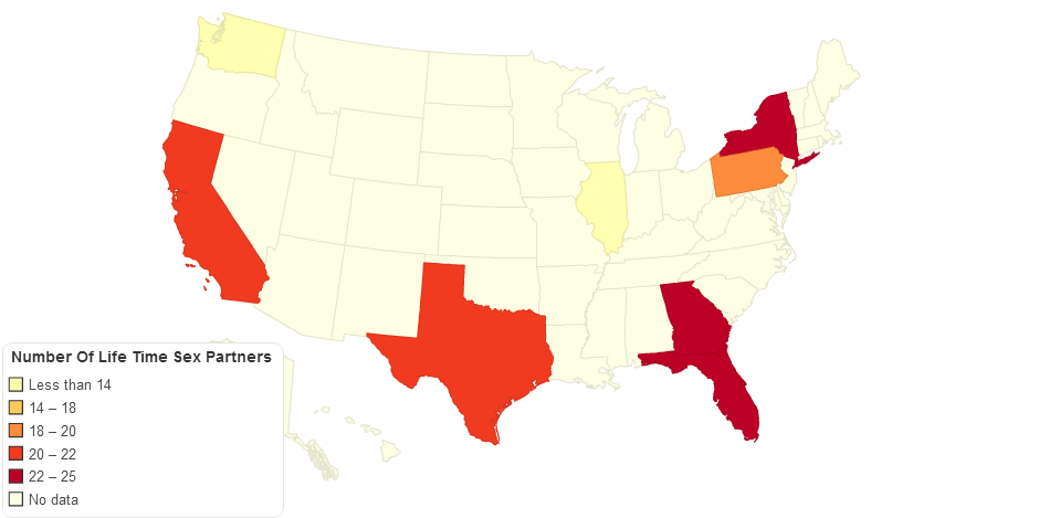 | ISO 3166 Code | American Cities | Lifetime sex partners | Daily thoughts about sex | Sense of sexual adventure (In %) | Faked an orgasm (In %) | Rate of sexual satisfaction (In %) | Open to using a vibrator (In %) | Sexual Frequency per year (In %) |